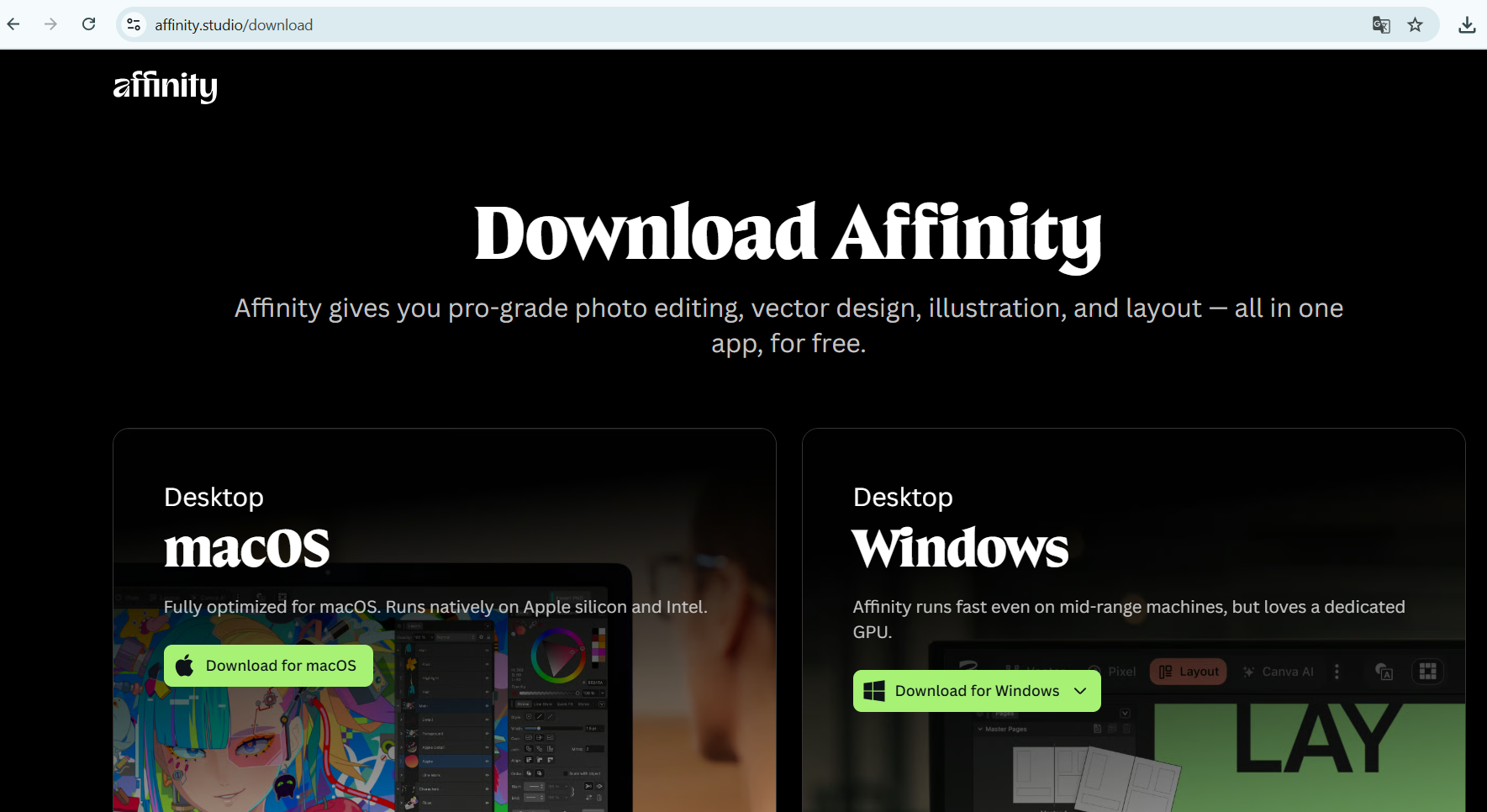 Bước 1: Vào website Affinity và chọn phần mềm tải xuống phù hợp với hệ điều hành.