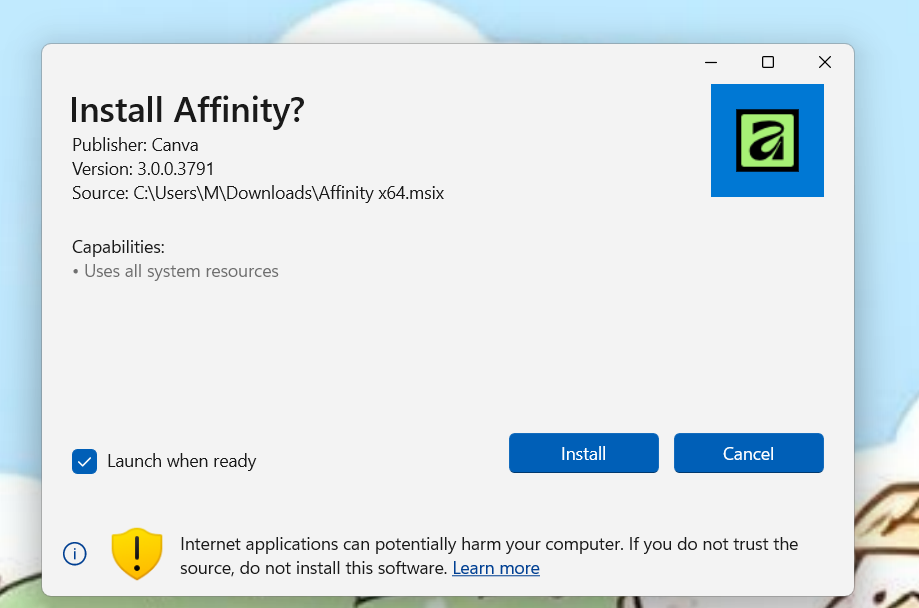 Quá trình cài đặt phần mềm Affinity - Ảnh: CHỤP MÀN HÌNH